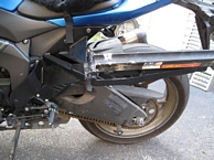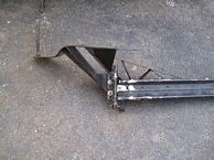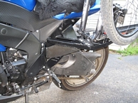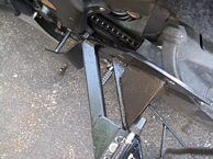 You can see the solid rod that goes through the frame bolt. This is what stabilizes the rack. If not for this the rack wouldn't work. The top of the mount bolts to the passenger peg bolt location. I bent the flat bar to hug the side of the bike, then added reinforcement.